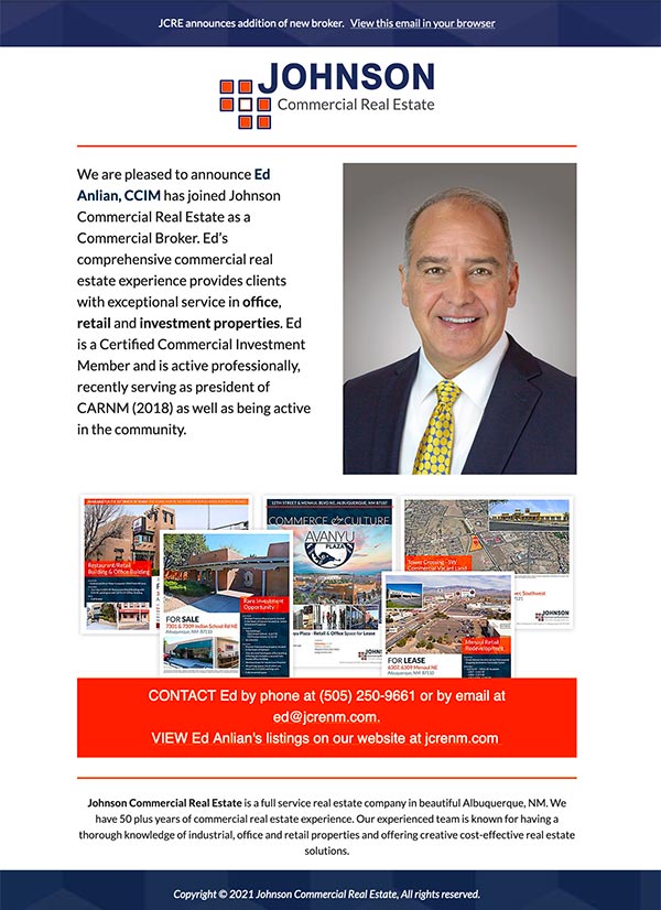 Updated existing logo and created flyer templates, email templates and other marketing collateral for commercial real estate brokerage. Updated the design using refined color palette, new fonts and photography.